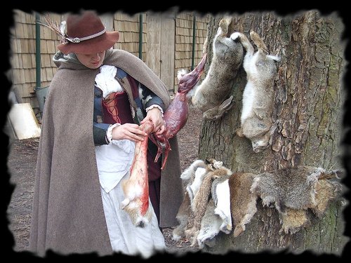 A wittawer skinning a hare, taking great care not to damage the pelt.